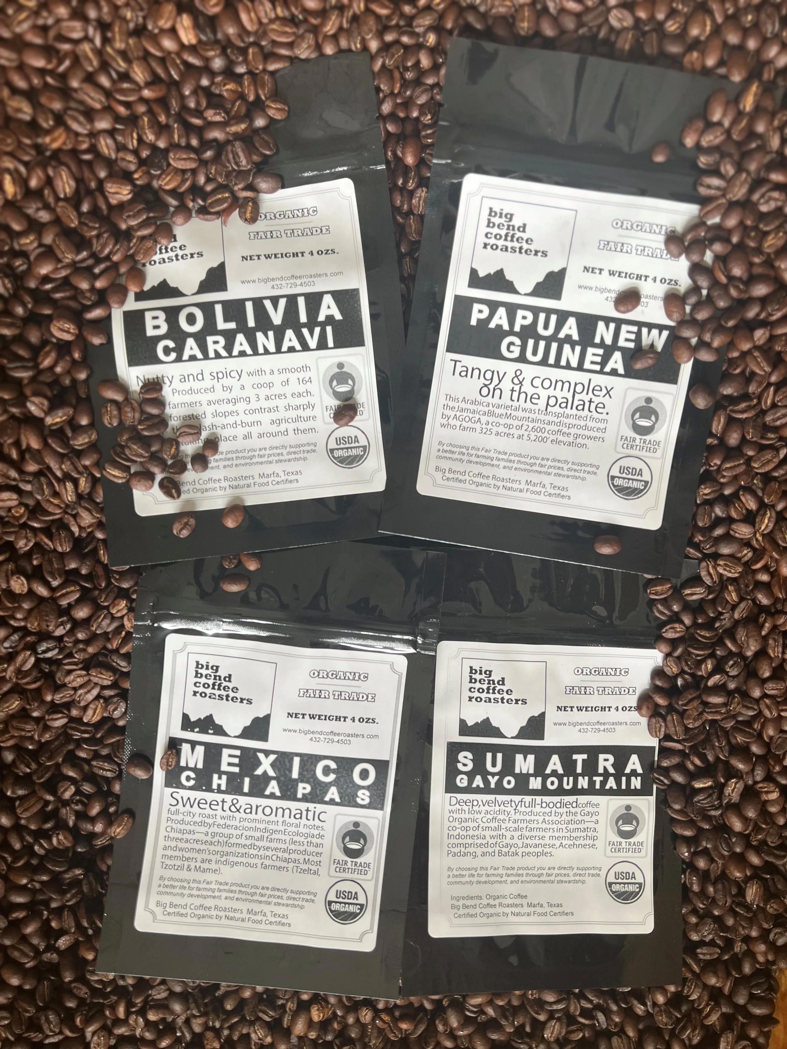 Categories: All Single Origin Dark Roasts Medium Roasts Light Roasts Merchandise All | Single Origin | Dark Roasts | Medium Roasts | Light Roasts | Merchandise | BBCR Postcard Pack from $1.50 Ceramic Campfire Coffee Mugs $12.95 SAMPLE PACKS $19.00 VIVA LA FEMINISTA from $16.25 BIG BLEND OF TEXAS from $16.75 BOLIVIA CARANAVI from $16.25 BORDERLANDS from $16.25 CATTLEMANS CUP from $16.25 COLOMBIA CAFE FEMENINO from $16.75 Sold out CONJUNTO from $16.25 CONQUISTADOR from $16.25 DARK SKIES from $17.75 DAVIS MOUNTAIN BLEND from $16.75 DECAFFEINATED ITALIAN ESPRESSO from $17.75 DECAFFEINATED MEXICO CHIAPAS from $17.75 DOUBLE FRENCH DUO from $16.75 ETHIOPIA YIRGACHEFFE from $17.75 GUATEMALA MAYA IXIL from $16.25 Sold out ITALIAN ESPRESSO from $16.25 MEXICO CHIAPAS from $16.25 PACIFIC NORTHWEST ESPRESSO from $16.25 PAPUA NEW GUINEA from $16.25 PRIMITIVO from $16.25 SUMATRA GAYO MOUNTAIN from $16.75 TEXSPRESSO from $16.75 TODDY BLEND from $17.75 WEST TEXAS WILDFIRE from $16.75 K-Cups $9.00